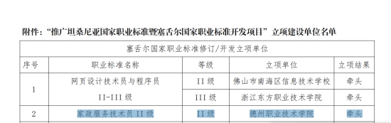 近日,中非职业教育联盟下发了《关于开展“推广坦桑尼亚国家职业标准暨塞舌尔国家职业标准开发项目”立项建设单位遴选工作的通知》,beat365在线唯一官网积极申报的家政服务技术员 II 级职业标准立项成功,beat365成为塞舌尔国家职业标准修订/开发立项单位。