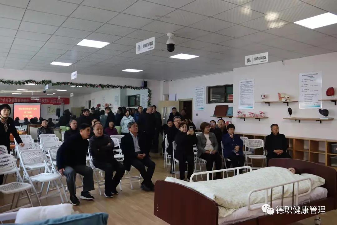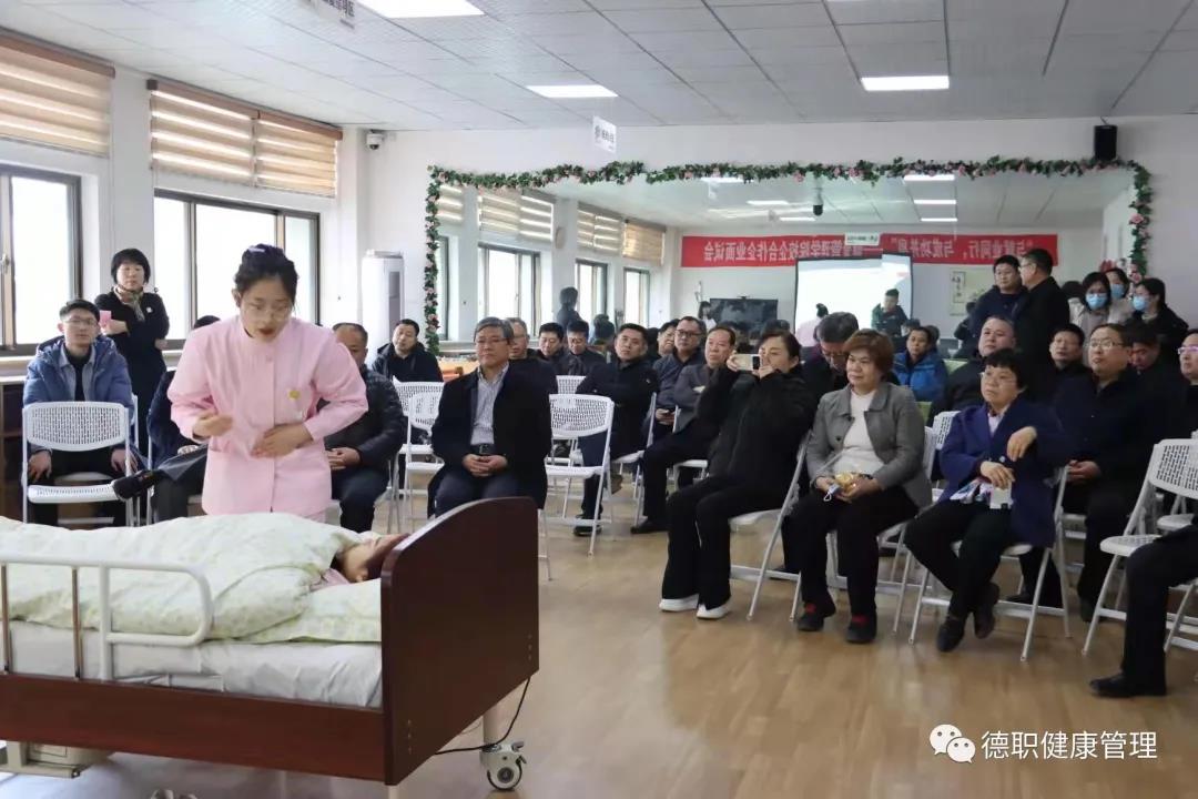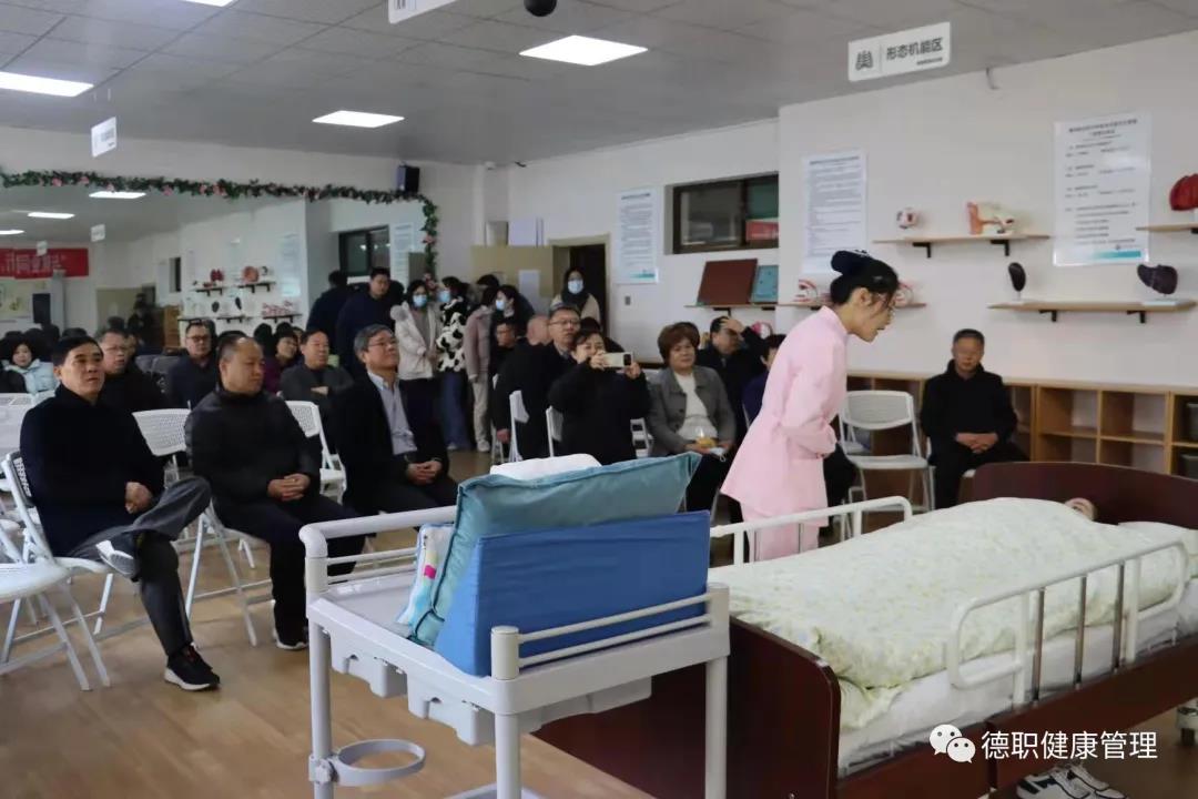 最后,刘斐斐老师介绍了beat365一年来的亮点工作和技能大赛取得的成绩,指导获得省“技能兴鲁”健康照护赛项二等奖的吕莲莲同学进行“协助偏瘫老人进行床上翻身训练”的演示汇报,现场观摩团的领导和老师们认真观看,跟随汇报的同学一起模拟,大家表示这样贴近生活实际的技能非常有推广的价值。