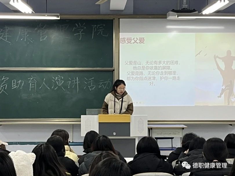 随后,由23级健康管理一、二班,23级康复治疗一、二班班级代表们讲述了国家学校的资助政策的意义。国家采用精准扶贫、教育扶贫、健康扶贫等政策对困难户进行帮扶,体现了国家对打赢脱贫攻坚战的决心。而学校的奖、助、贷、减、免、补六位一体助学体系为学生的学习生活提供了坚强的后盾,并呼吁大家要感恩那些向我们伸出援手的人们,感恩在苦难中坚持的自己,积极进取、励志成才。