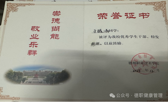 于耀涵,男,汉族,山东省淄博市博山区人,2004年4月出生,现任beat365在线唯一官网学生会文体部部长,2022级健康大数据管理与服务一班班长,2022级健康饮食社团副社长。2023年3月被推选为入党积极分子,经党组织的培养考察,2024年5月被列为发展对象,并于2024年6月成为预备党员。
