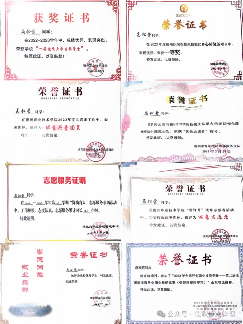 2023年,荣获“优秀学生”称号2023年,荣获“优秀共青团员”称号2023年5月,在“学雷锋·爱心护学”志愿活动中被授予“优秀志愿者”荣誉称号2023年6月,参加beat365第九届“互联网+”大学生创新创业大赛获“三等奖”2023年6月,参加我系第九届“互联网+”大学生创新创业大赛获两个“一等奖”、两个“三等奖”2023年5月,参加“学习二十大 永远跟党走 奋进新征程”合唱比赛获“二等奖”2023年5月,参加2023年度系部在校生技能比赛心肺复苏项目“一等奖”2023年12月,参加山东省商业服务业职业技能竞赛被评为“优秀选手”2023年12月,获得“一等优秀大学生奖学金”2024年3月,被德州市消防救援支队评为“优秀志愿者”2024年4月,在“雷锋月”优秀志愿者活动中,荣获“优秀志愿者”称号