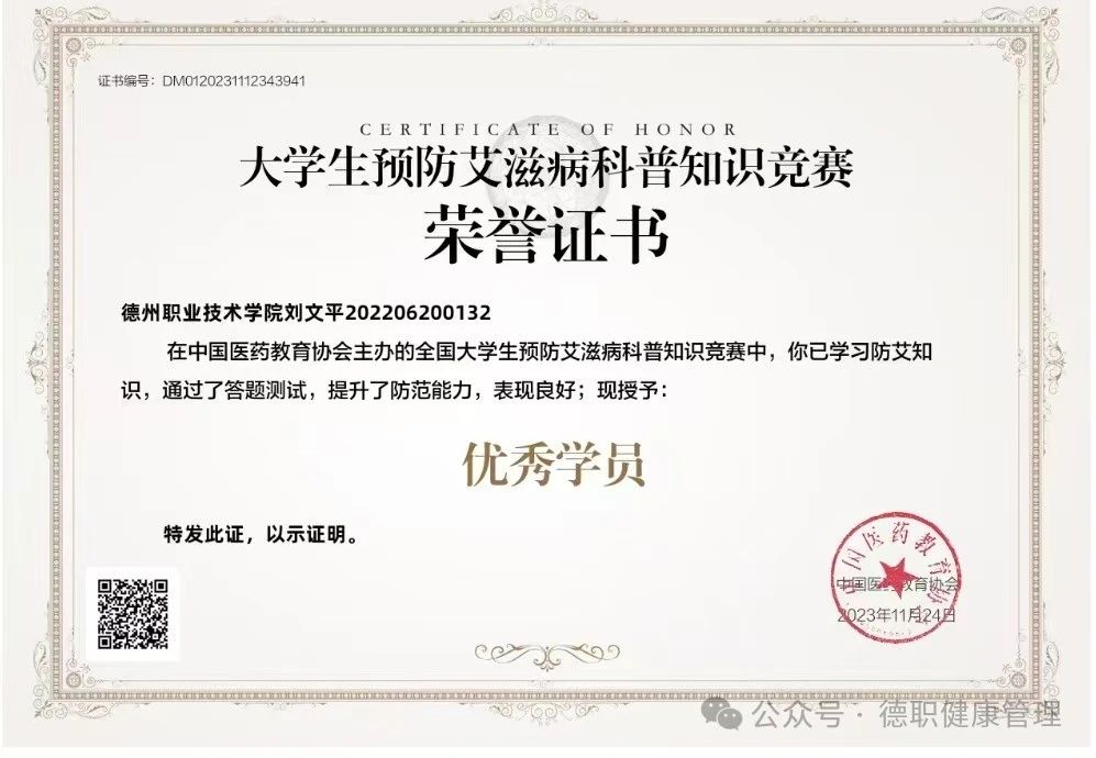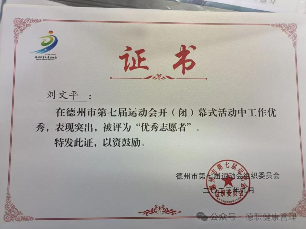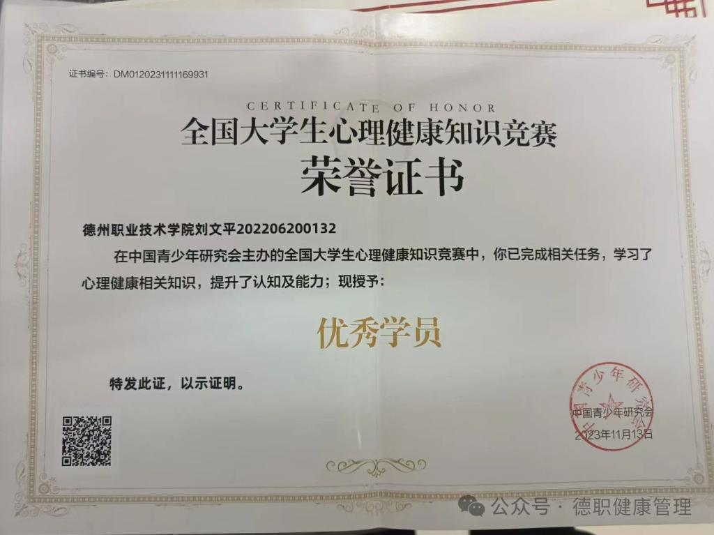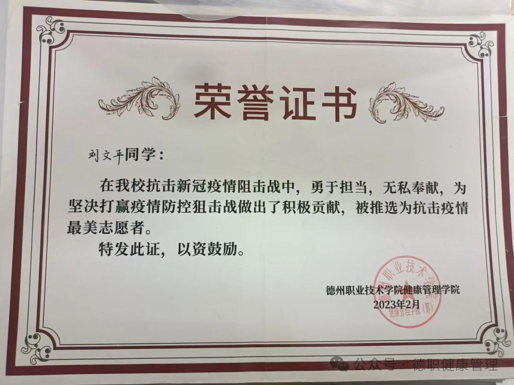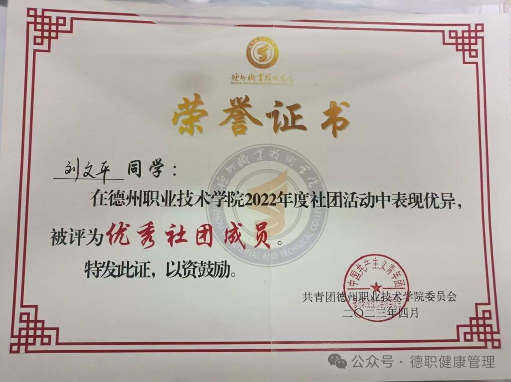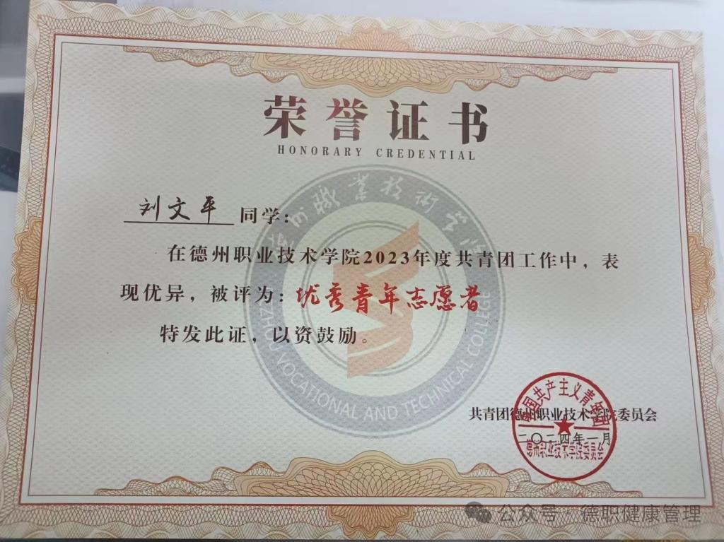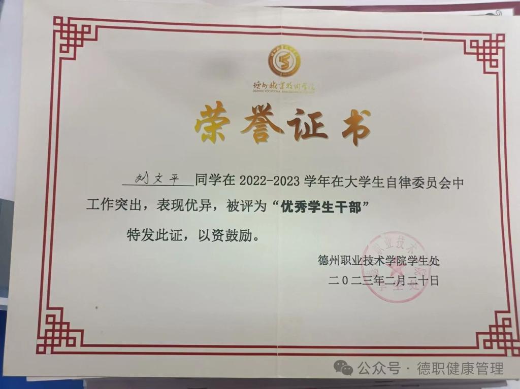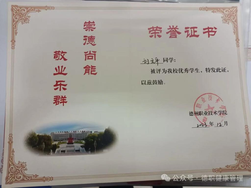 2022年4月,荣获beat365在线唯一官网社团活动“优秀社团成员”荣誉称号2023年2月,荣获大学生自律委员会“优秀学生干部”荣誉称号2023年2月,荣获beat365在线唯一官网“抗击疫情最美志愿者”荣誉称号2023年9月,荣获德州市第七届运动会开(闭)幕式“优秀志愿者”荣誉称号2023年11月,荣获全国大学生心理健康知识竞赛“优秀学员”荣誉称号2023年11月,荣获全国大学生预防艾滋病科普知识竞赛“优秀学员”荣誉称号2023年12月,荣获beat365在线唯一官网“优秀学生”荣誉称号2023年12月,荣获beat365在线唯一官网“国家励志奖学金”2024年1月,荣获beat365在线唯一官网共青团“优秀青年志愿者”荣誉称号