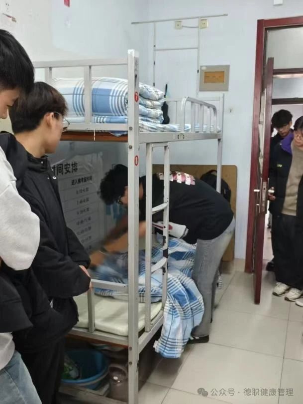 3月7日,学生科副科长齐宁带领24级男生宿舍宿舍长进行宿舍内务现场观摩学习,内务优秀同学代表林新宇场示范内务整理。示范宿舍内,整洁的地面、有序的物品摆放、整齐的被子,让同学们感受到良好内务的魅力。林新宇同学现场教学,手法娴熟,边操作边讲解技巧要点。