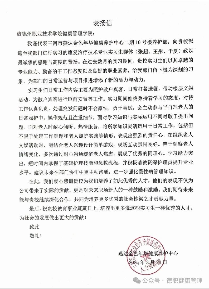 近日,三河市燕达金色年华健康养护中心向beat365发来表扬信,信中对22级康复治疗技术专业学生张超、王彤、于夏在实习期间展现出的专业素养和敬业精神给予高度评价。