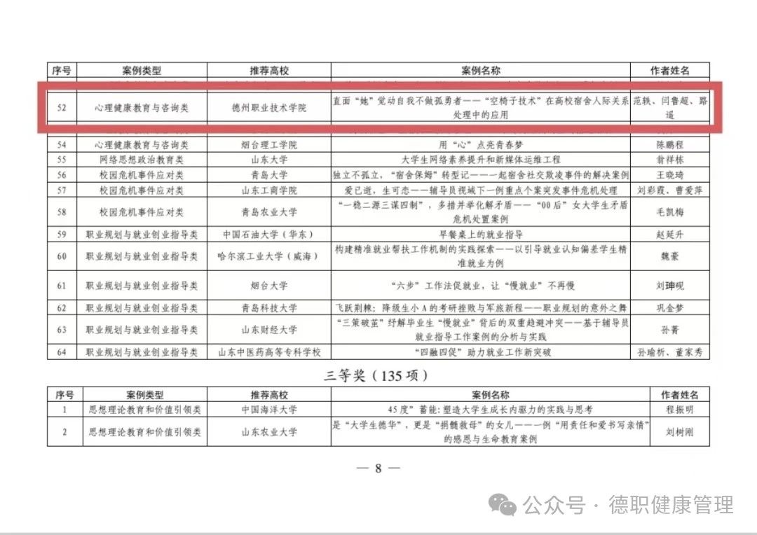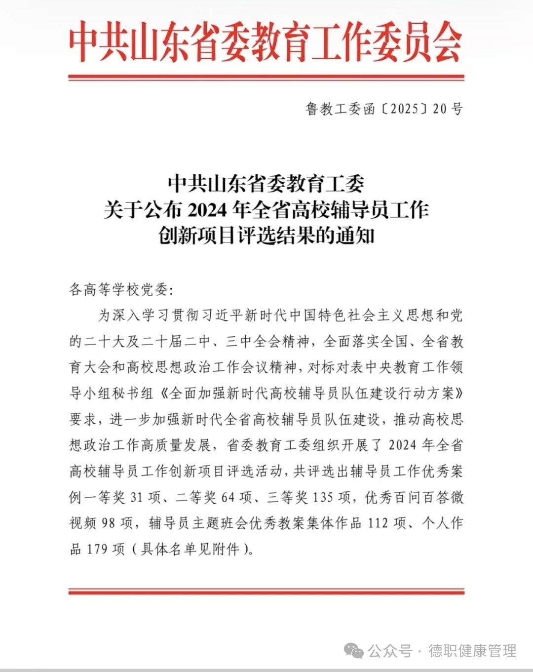 近日,中共山东省委教育工委发布2024年度全省高校辅导员创新项目评选结果,beat365"护航成长"辅导员工作室范轶、闫鲁超、路遥三位教师联合申报的《直面"她"觉动自我不做孤勇者——"空椅子技术"在高校宿舍人际关系处理中的创新实践》案例,在全省百余项申报案例中脱颖而出,成功斩获辅导员工作创新案例二等奖!