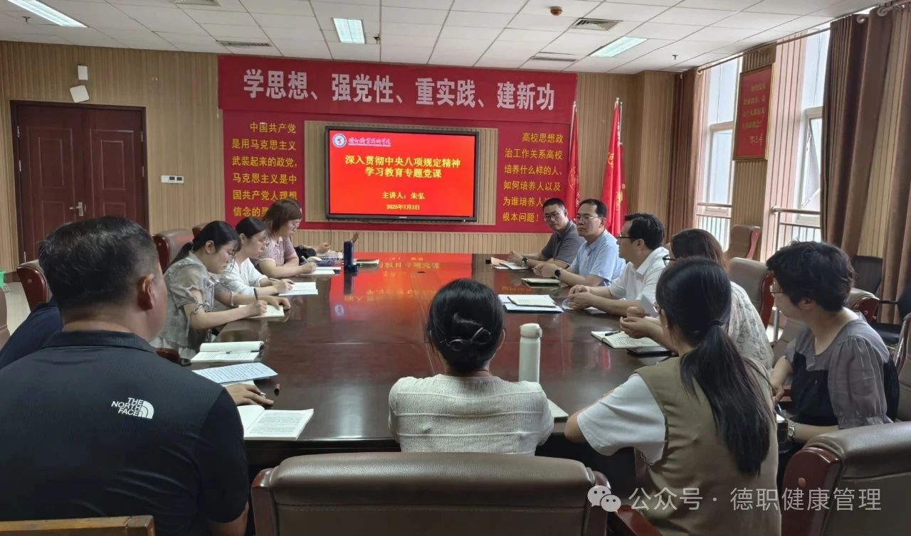 根据学校开展深入贯彻中央八项规定精神学习教育工作方案安排,7月4日,校党委委员、党政办公室主任、宣传部部长朱弘以《作风建设要常抓不懈》为题,为beat365在线唯一官网全体党员讲授专题党课。beat365在线唯一官网党总支书记范轶、 副书记王英博,全体党员参加学习。