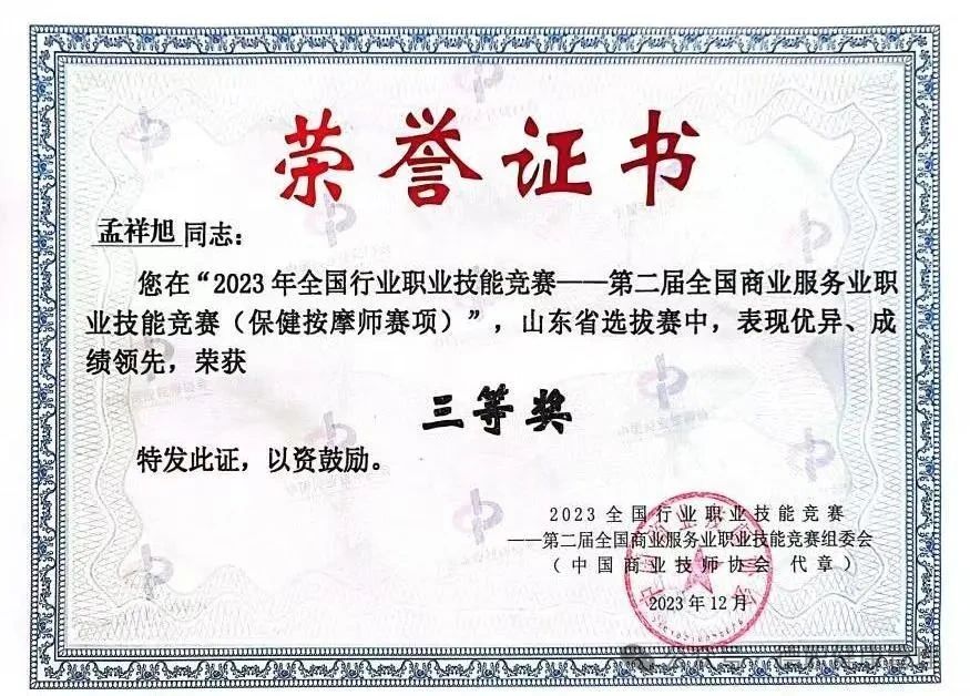 2.2023年荣获“全国保健按摩师三等奖”;
