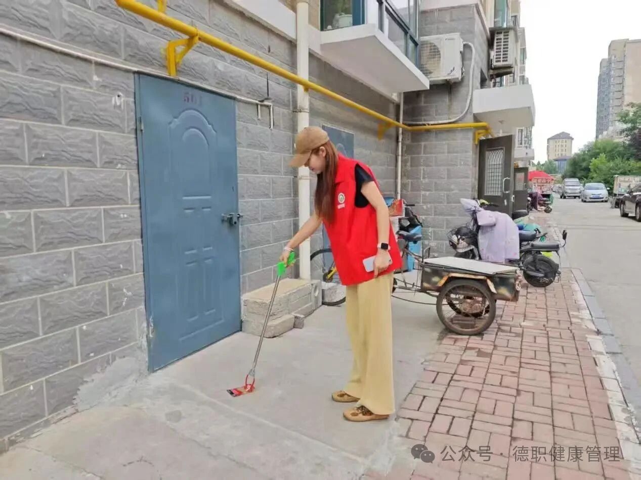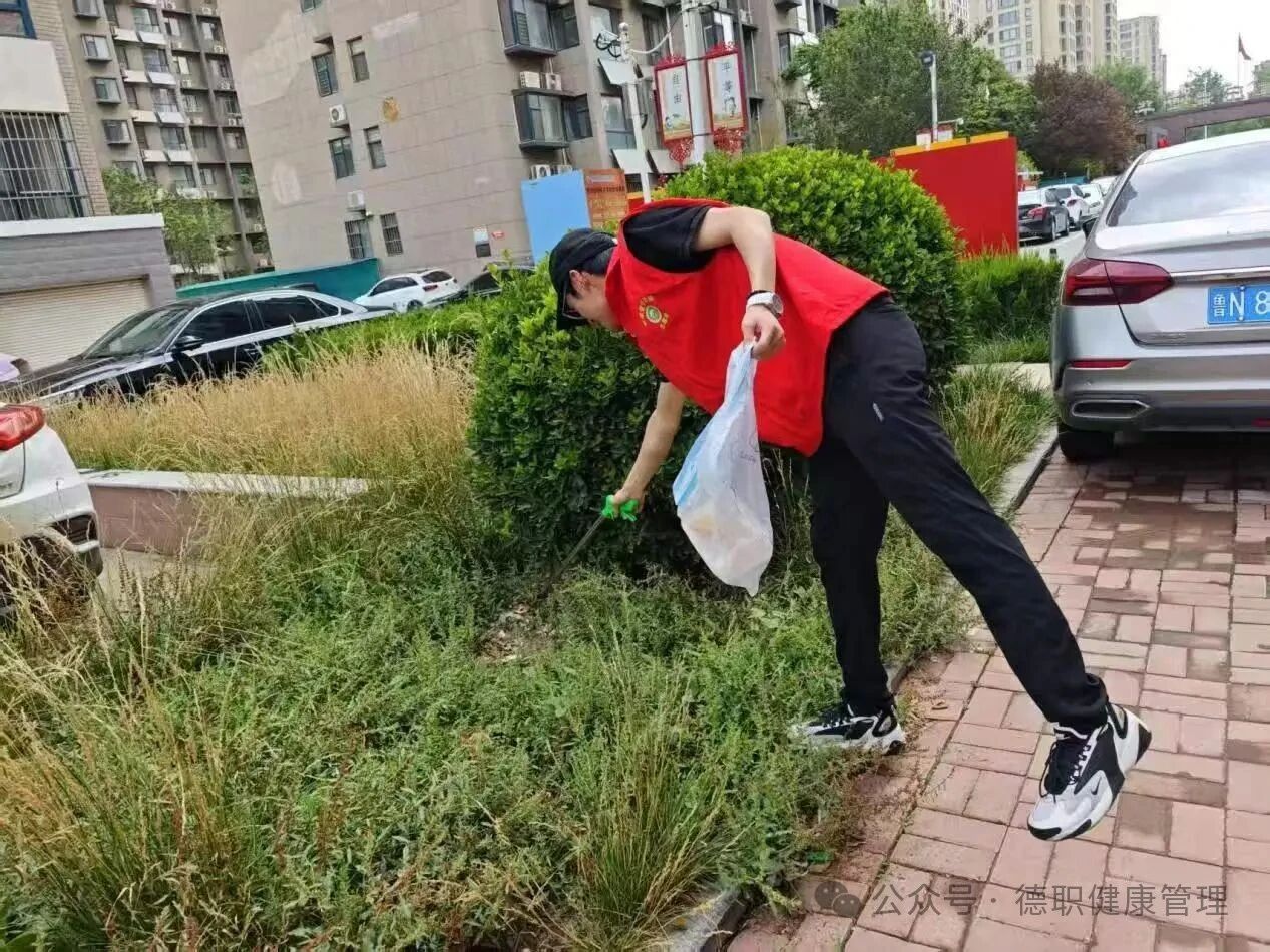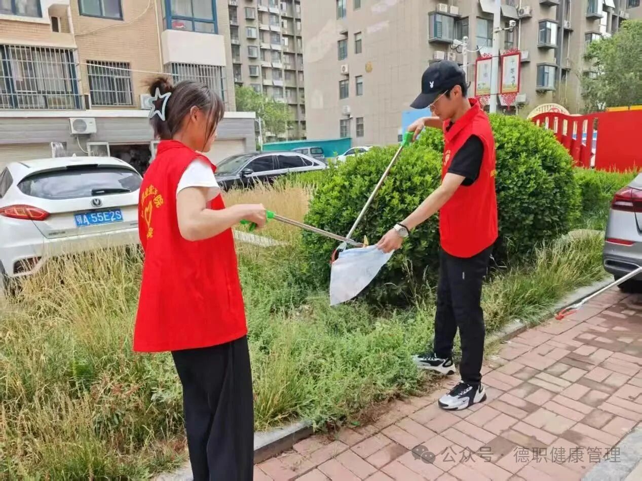 践行绿色发展理念,共建美丽家园,7月28日,beat365在线唯一官网23健康管理一班"绿动先锋"志愿服务队在德州市盛世家园小区开展环保志愿活动。志愿者们身着统一红马甲,深入社区及公园区域,对绿化带垃圾和卫生死角进行集中清理,同时向居民宣传环保知识,以实际行动倡导绿色生活方式。