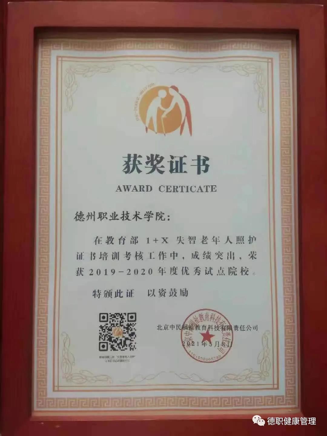 5月8日,教育部1+X失智老年人照护职业证书试点院校考核工作暨2020年度优秀试点院校表彰会在西安成功召开,beat365因在2020年度培训考核工作中成绩突出,获得“教育部1+X失智老年人照护证书考核工作优秀试点院校”荣誉称号。