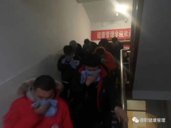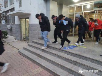 4点40分,消防安全演练正式开始。学生会干部引导楼内学生快速疏散,同学们都用湿毛巾捂住口鼻,弯腰低头,有序快速地撤离出3号楼,迅速到达安全场地集合。