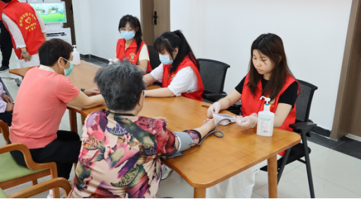 虽然天气炎热,但志愿者们早早来到活动现场,做好准备工作,社区老人们已经开始等候了。活动现场热闹非凡,老师们耐心与老人们交流,为他们提供测血压、测血糖等服务,并向他们讲解健康保健知识。针对出现“三高”症状的居民给予注意饮食、