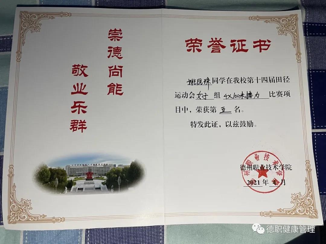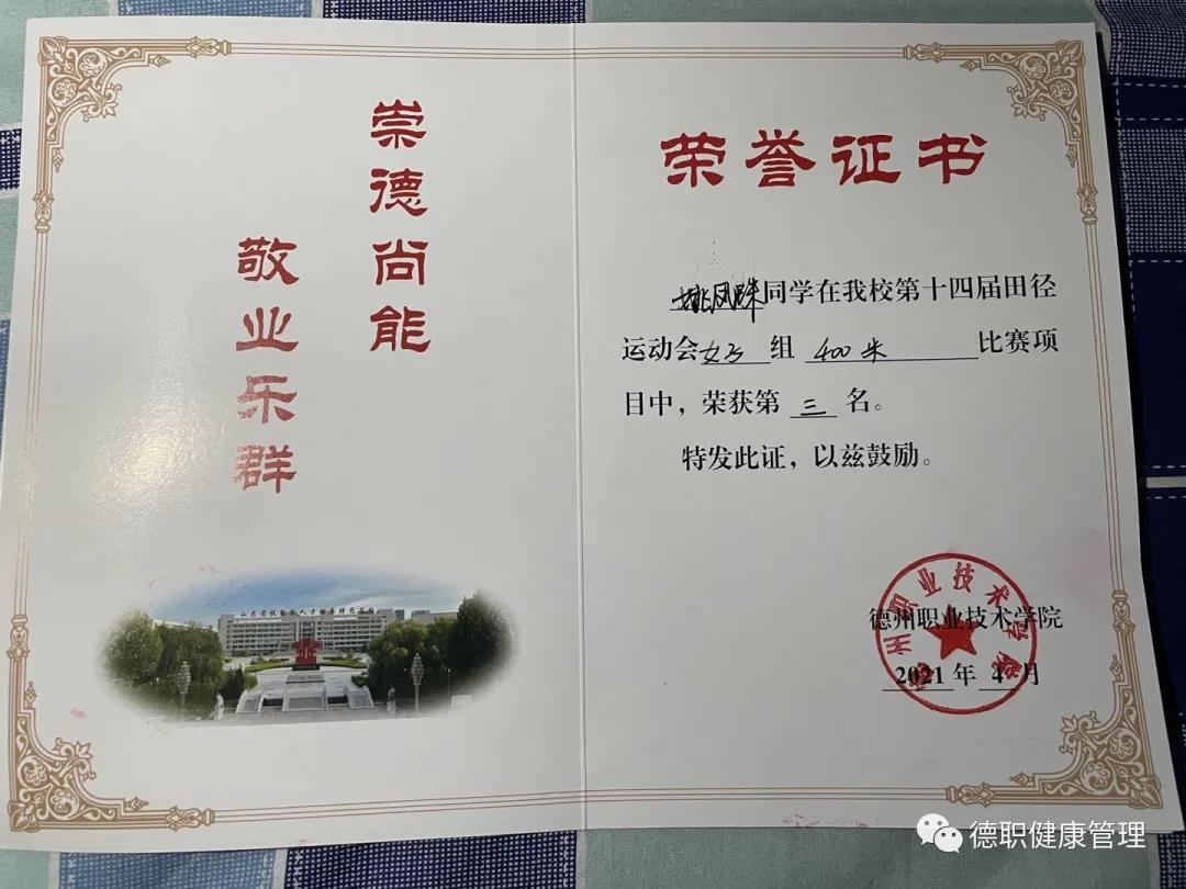 400米一等奖。今年又代表系里参加校运会,获得了女子400米第三名,4