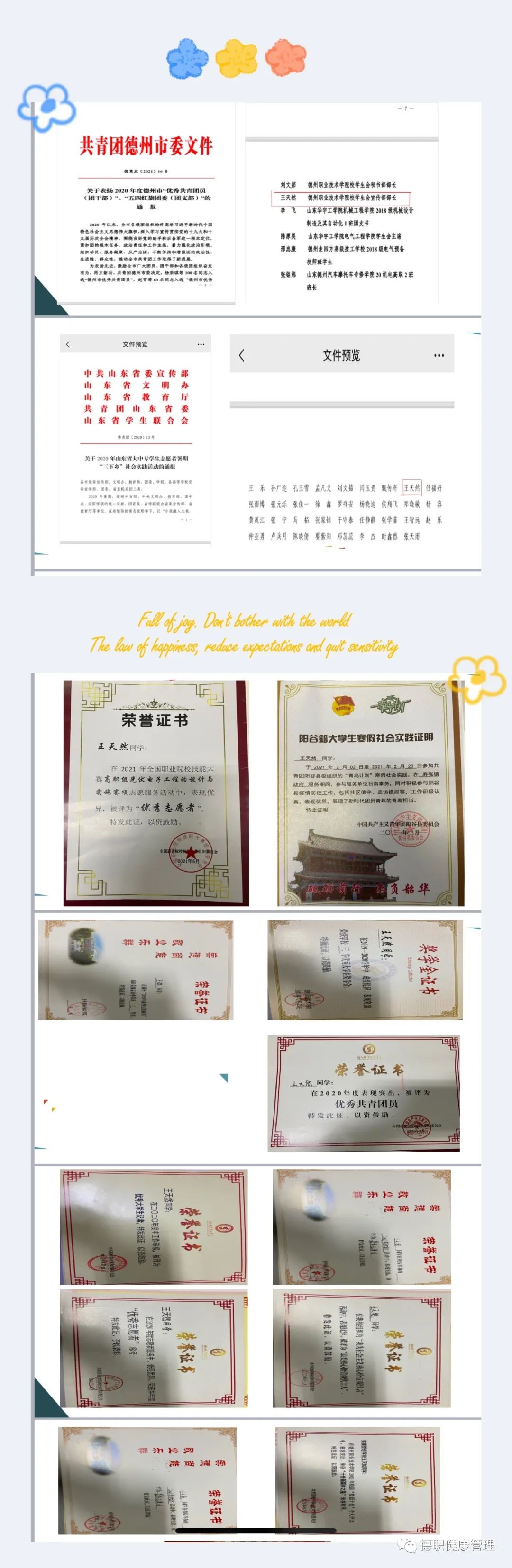 上高中时常听老师说“上了大学你们就轻松了”,亲身经历过后,我想说在大学里,我们可以选择轻松或忙碌的生活方式,但最重要的是发现自己的长处,找到自己的热爱,明确自己的目标。青春就是不怕犯错,在这里我尝试了许多人生第一次,做了很多现在回想起可能很傻的蠢事,但正是这些经历让我成长,它们都是我人生的宝贵财富。一转眼,大学的旅程就要告一段落,感谢这三年帮助过我的师长,感谢给予我温暖与感动的同学,更要感谢我自己的努力,人生路漫漫,未来很长,梦还很远,希望我能一直保持对生活的热爱,对事物的好奇,继续跨过人生的一个个三年。最后祝福大家未来万事胜意,也祝愿德州职院越来越好!