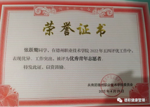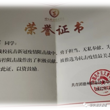 他积极向党组织靠拢,现已是一名入党积极分子,服从管理,热爱集体,团结同学,集体荣誉感强,课余时间还积极参与社会志愿服务活动,如参加校园和社区疫情防控、进行特殊教育学院义演等,被评为优秀青年志愿者、抗击疫情最美志愿者,此外还利用暑期参与山东省青鸟计划,在退伍军人服务站实习实践,被评为优秀实习生。