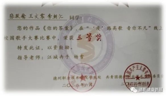 人生三学,学而无厌,学无止境,学以致用。在大一期间综合测评与期末成绩均居本班第一,积极参与技能大赛,获得山东省技能兴鲁职业技能大赛健康管理项目一等奖,德州市技能兴德职业技能大赛健康管理项目一等奖,张跃骜不仅自己成绩优秀还积极带动同学学习,组织了期末数学突击小组并担任主讲。